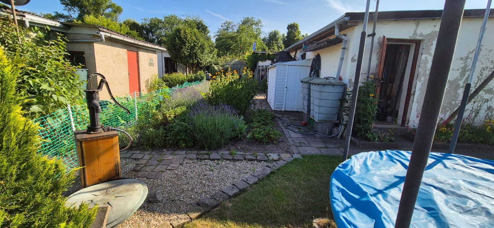 Zwei Regenwassertonnen inkl. passiver Bewässerung. Und eine nicht verbaute Gartenteichwanne.